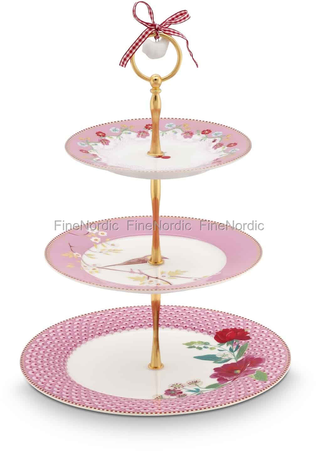Dieser dreistufige Kuchenständer eignet sich perfekt für die Präsentation von Cupcakes, individuellen Desserts, Vorspeisen und vielem mehr. Diese fantastische Etagere vereint drei verschiedene Print Designs aus der Floral Kollektion. Sie besteht aus einer goldfarbenen Mitte und drei Ebenen. Die obere Ebene hat einen Durchmesser von 17 cm, die mittlere 21 cm und die untere einen Durchmesser von 26,5 cm. Jede Ebene ist mit der markanten rot-weiß gestreiften Linie von Pip Studio mit goldenen Details verziert. Sie wird das Herzstück und die Hauptattraktion auf Ihrem Geburtstagstisch sein!