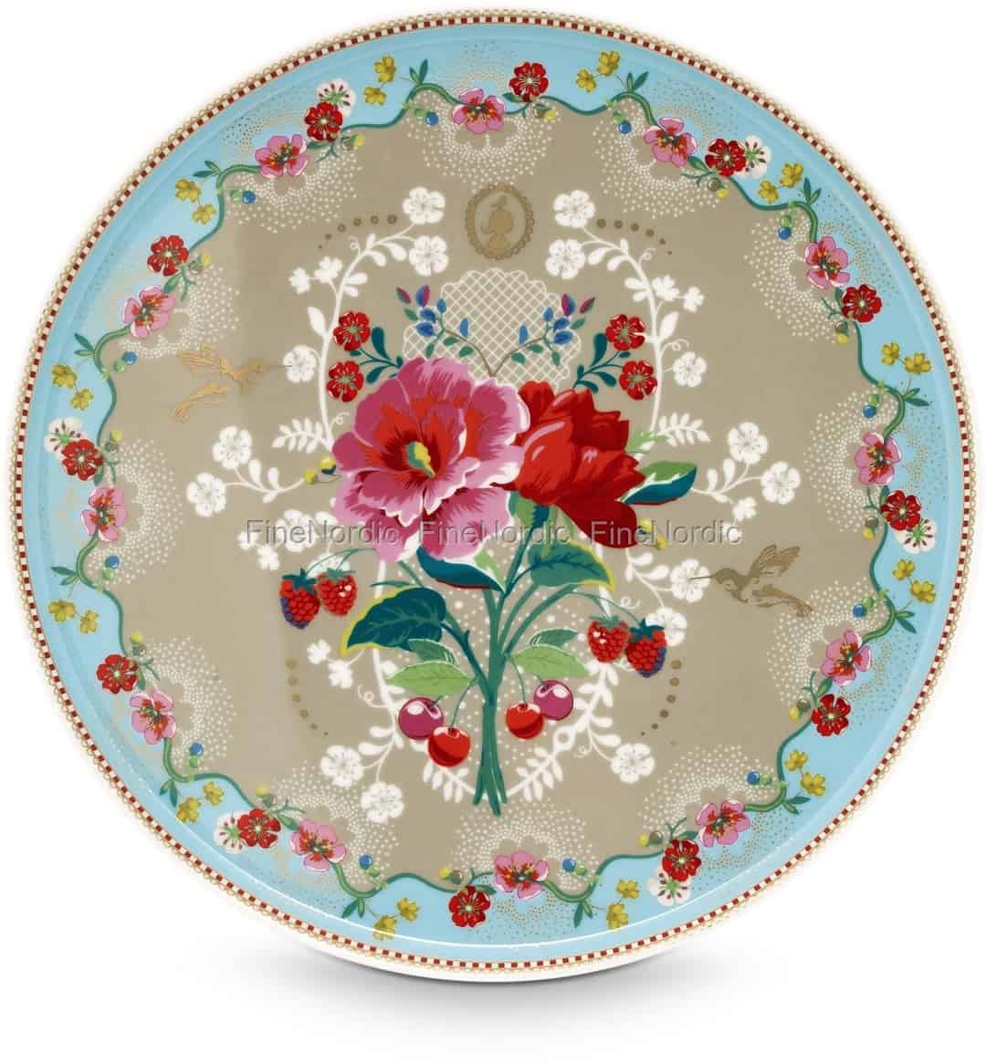 Präsentieren Sie Ihren Gästen Ihren selbstgebackenen Kuchen auf diesem großen Kuchenständer von Pip Studio. Er ist mit dem romantischen Rosendesign von Pip Studio aus der Floral Kollektion verziert. Er wurde mit viel Liebe gemacht, bis ins kleinste Detail, wie der schimmernde goldfarbene Kolibri und das Pip-Logo beweisen. Die Hintergrundfarben und die bunten Früchte und Beeren harmonieren farblich gut miteinander. Die Kanten werden von dem markanten rot-weißen Pip Streifen und goldfarbenen Details umkreist. Der Tortenständer besteht aus 100% Porzellan und hat einen Durchmesser von 30,5 cm. Es wird eine schöne Ergänzung Ihrer Pip Studio Sammlung sein.