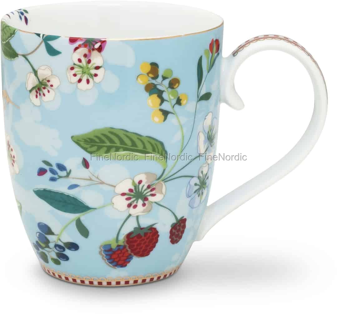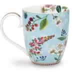 Die Pip Studio Floral Tasse Extra Large Hummingbirds Blue sollte auf jeden Fall ein Teil Ihrer Pip Studio Sammlung werden. Diese extra große Tasse hat nicht nur ein Fassungsvermögen von 450 ml, sondern sieht auch richtig schön aus. Der blaue Hintergrund auf der Außenseite der Tasse ist mit verschiedenen Beeren- und Blumenarten bedeckt. Dieses Design reicht teilweise auch bis in das weiße Innere der Tasse hinein. Entlang der unteren Kante der Tasse und am Griff befindet sich der markante rot-weiße Pip Streifen mit goldenen Akzenten. Bitte spülen Sie die Tasse von Hand, denn wegen ihres goldenen Dekors ist sie weder für die Spülmaschine noch für die Mikrowelle geeignet.