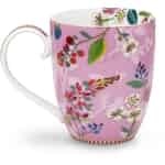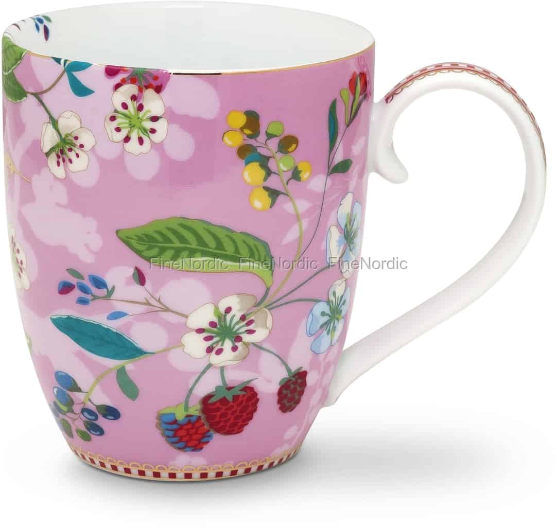 Die Pip Studio Floral Tasse Extra Groß Hummingbirds Pink ist ein absolutes Muss für jeden Pip Studio Sammler. Sie können sie nicht nur mit bis zu 450 ml Ihres Lieblingsgetränks füllen, sie ist dazu auch sehr attraktiv anzusehen. Der rosa Hintergrund auf der Außenseite der Tasse ist mit blühenden Blumen und Beeren bedeckt, und das Design reicht zu Teil bis in die weiße Innenseite der Tasse. Entlang der unteren Kante der Tasse und am Henkel sehen Sie den markanten rot-weißen Pip Streifen mit goldfarbenen Akzenten. Wir empfehlen, die Tasse mit der Hand zu waschen, denn aufgrund ihres goldenen Dekors ist sie weder für die Spülmaschine noch für die Mikrowelle geeignet.
