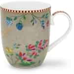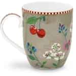 Trinken Sie Ihren Tee, Kaffee oder heiße Schokolade von dieser gut aussehenden Hummingbirds Khaki Tasse. Diese Pip Studio Tasse hat einen khakifarbigen Hintergrund und ist mit einem bunten Frucht- und Blumenmuster verziert. Entlang der Oberkante und des Henkels ist die markante rot-weiß gestreifte Linie von Pip mit goldenen Details zu sehen. Sie hat ein Fassungsvermögen von 145 ml und ist gut an ihrem großen Henkel zu halten. Sie kann mit dem anderen Hummingbirds Khaki Geschirr kombiniert werden, das Sie hier in unserem Webshop finden. Dieses Muster ist auch in einer rosa und einer blauen Version verfügbar.