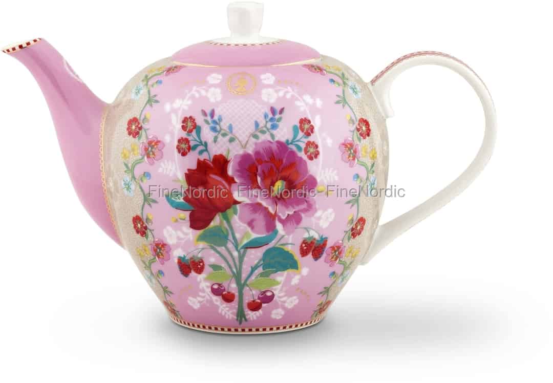 Um eine richtige Tee Party veranstalten zu können, benötigen Sie Sachen wie Teetassen und Untertassen, Tee und vor allen Dingen aber auch eine Teekanne. Schauen Sie sich doch mal diese große Floral Teekanne von Pip Studio an. Sie ist mit dem romantischen Rose Pink Muster verziert, was u.a. aus schönen Details wie einem zu einer Rose geformten Griff am Deckel und dem markanten Rot-, Weiß- und Goldfarbenen Pip Streifen an den Rändern, am Ausguss und am Griff besteht. Sie hat überwiegend einen rosa Hintergrund und die roten Blüten, Kirschen und Erdbeeren fallen einem sofort ins Auge. Die Teekanne fasst 1,6 l und besteht aus hochwertigem Porzellan. Servieren Sie Ihren Tee stilvoll mit dieser fantastischen Rose Teekanne von Pip Studio.