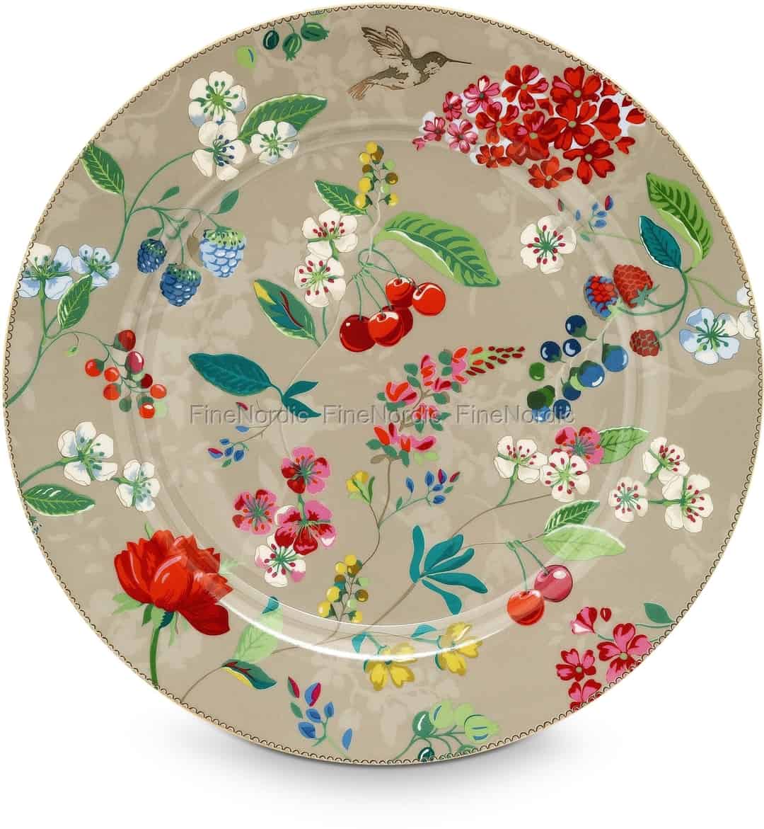 Wenn Sie den Tisch für ein großes Abendessen oder für einen formellen Anlass decken möchten, dann legen Sie zunächst einen großen Unterteller auf den Tisch. Wie diesen gut aussehenden Hummingbirds Khaki Teller von Pip Studio. Er ist Teil der Floral Kollektion und hat eine khakifarbene Hintergrundfarbe. Er ist mit dem Hummingbirds Design von Pip Studio dekoriert, das aus einem verspielten Print aus Früchten und Blumen und einem goldfarbenen Kolibri besteht. Er hat einen Durchmesser von 32 cm und besteht aus 100% Porzellan. Er kann mit anderen Tellern aus der Floral Kollektion oder mit einfarbigen Tellern kombiniert werden. Der Hummingbirds Unterteller ist auch in einer rosa und einer blauen Version hier in unserem Webshop erhältlich.