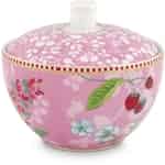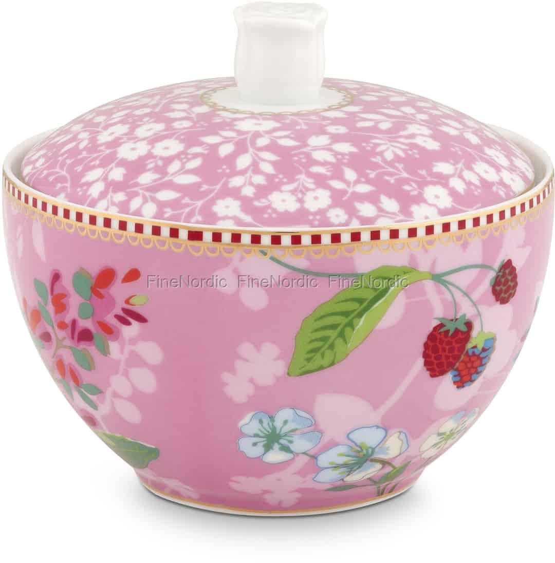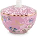 Halten Sie in dieser hübschen Zuckerdose Hummingbirds Pink aus der Floral Kollektion von Pip Studio etwas Zucker für Ihre Kaffeeklatsch Gäste bereit. Der rosa Hintergrund der Hummingbirds Zuckerdose ist mit einem wunderschönen Blumenmuster und goldenen Details verziert. Der obere Rand der Dose ist mit Pips berühmter rot-weiß gestreifter Linie mit goldenen Akzenten geschmückt. Haben Sie denn den goldfarbenen Kolibri schon entdeckt? Kombinieren Sie diese Zuckerdose mit den anderen Hummingbirds Pink Produkten aus der Floral Kollektion oder lassen Sie sie neben einfarbigem Geschirr hervorstechen. Sie wird auch eine schöne Ergänzung Ihrer Pip Studio Sammlung sein.