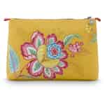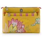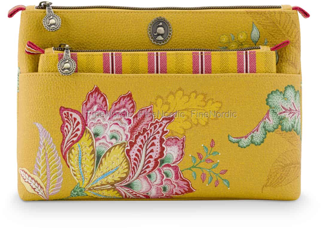 Bewahren Sie Ihre Kosmetikprodukte sicher in diesem Kosmetikbeutel Combo Jambo Flower Yellow auf. Die gelben Taschen haben zwei verschiedene Größen und Designs und die kleinere Tasche passt gut in die Vordertasche der größeren Tasche. Der größere Jambo Flower Yellow Beutel ist mit einem wunderschönen exotischen Blumenmuster verziert, während der kleinere Kosmetikbeutel mit Streifen geschmückt ist. Die größere Tasche ist außerdem auch mit dem bekannten Pip Studio Emblem verziert, welches Sie auch auf den Reißverschlüssen beider Taschen sehen können. Der größere, blumige Kosmetikbeutel hat zwei zusätzliche Taschen im Inneren, sodass Sie Ihren Nagellack, Lippenstift, Eyeliner und alle anderen Schönheitsprodukte gut sortiert aufbewahren können. Stellen Sie diese Combo schön in Reichweite auf Ihre Badezimmerablage, oder nehmen Sie sie mit, wenn Sie verreisen wollen. Diese gut aussehende Combo besteht aus Satin mit wasserabweisender PVC-Beschichtung und sie ist sowohl Außen wie auch Innen wasserabweisend.