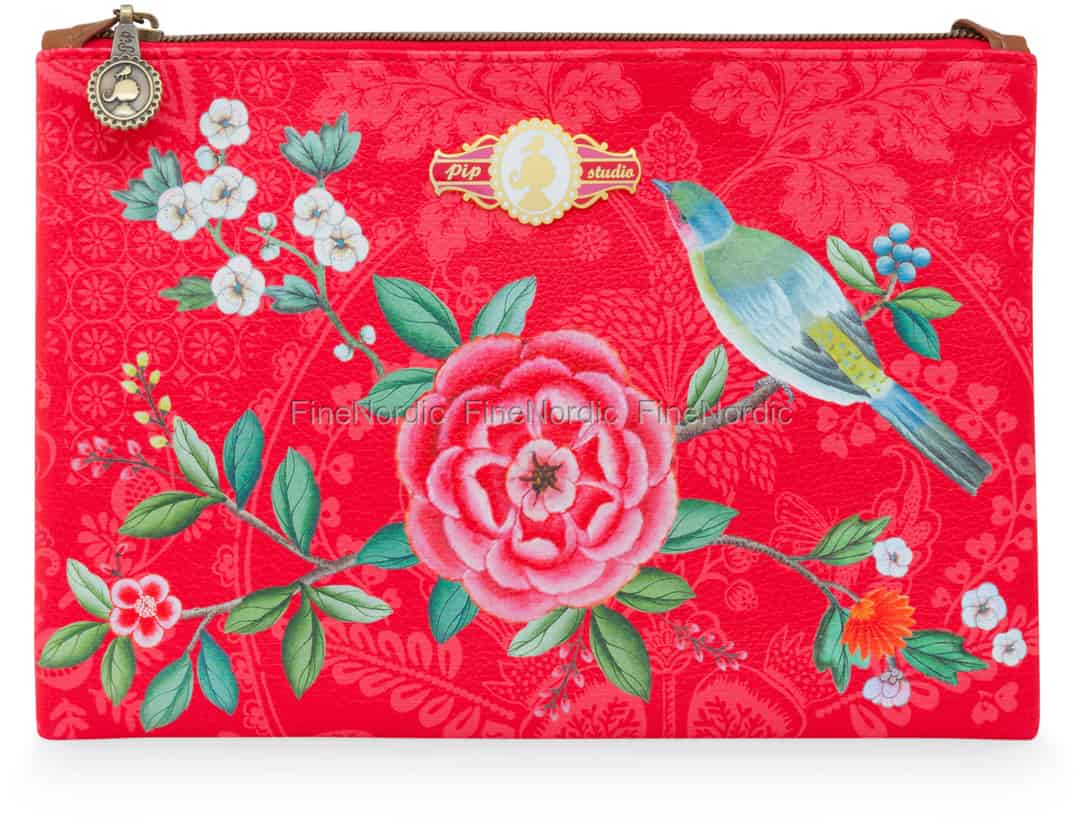 Sind Sie ein Fan der Good Morning Kollektion von Pip Studio? Dann könnte Sie dieser mittelgroße flache Kosmetikbeutel interessieren. Dieser rote Kosmetikbeutel ist aus wasserabweisendem Kunstleder gemacht. Der Beutel ist mit exotischen Blumen und einem Vogel geschmückt, welche sehr markant für die Good Morning Kollektion sind. Das Pip Logo finden Sie nicht nur auf Messing-Reißverschluss, sondern auch auf der Vorderseite der Tasche ist ein Emaille Pip Logo zu sehen. Fügen Sie den Kosmetikbeutel Ihrer Good Morning Sammlung hinzu oder schenken Sie es einem Pip Studio-Sammler. Wenn Ihnen das Good Morning Red Design genauso gut gefällt wie uns, dann können Sie sich gerne auch die anderen fantastischen Badprodukte mit dem gleichen Muster anschauen, die wir auf Lager haben. Sie finden sie alle hier in unserem Webshop.