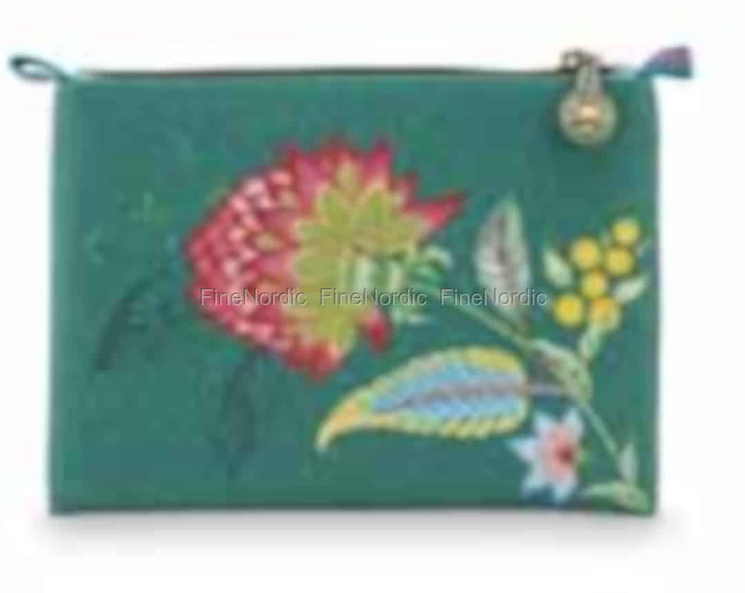 Der flache Kosmetikbeutel von Pip Studio hat einen grünen Hintergrund und ist auf der einen Seite mit einer großen Jambo Blume und auf der anderen Seite mit verschwommenen Linien verziert. Das Kosmetiktäschchen ist aus wasserabweisendem Satin gemacht und sein Futter ist genauso wasserabweisend. Pip Studio Fans werden sofort sehen, dass es sich hier um ein Pip Studio Kulturbeutelchen handelt. Dieser Kosmetikbeutel zeichnet sich nämlich durch sein farbenfrohes und fantasievolles Design und das berühmte Pip Studio Emblem, was auf der gestreiften Seite, sowie am Reißverschluss der Tasche zu sehen ist, aus. Mit diesem gutaussehenden Beutel können Sie Ihr Make-up sicher an einem Ort aufbewahren. Aufgrund seiner praktischen Größe können Sie ihn auch ganz einfach in Ihre Handtasche oder Reisetasche packen und mitnehmen.