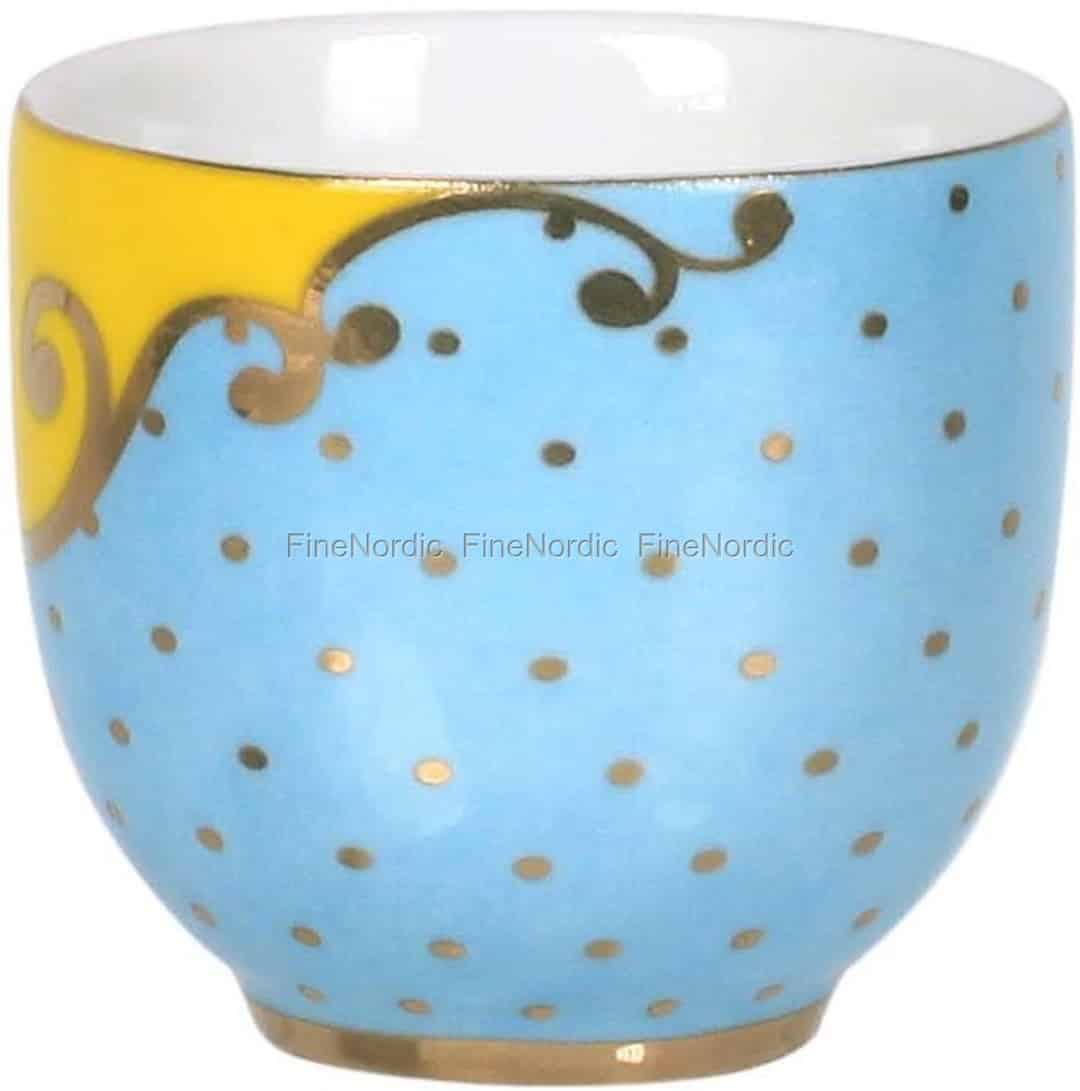Genießen Sie auch gerne ein ausgediegenes und luxuriöses Sonntagsfrühstück zusammen mit der Familie? Und sollte ein perfekt weichgekochtes 5-Minuten-Ei unbedingt ein Teil des Frühstücks sein? Mit dem Royal Eierbecher Blue von Pip Studio können Sie Ihr Frühstücksei auf königliche Art und Weise genießen. Auf der Außenseite des Eierbechers können Sie goldene Punkte auf blauem Hintergrund schimmern sehen. Ein kleiner Teil des Eierbechers hat einen einfarbigen gelben Hintergrund und eine goldene Rebe trennt die zwei unterschiedlich farbigen Bereiche. Der Eierbecher ist 5 cm hoch und hat einen Durchmesser von 5 cm. Kombinieren Sie ihn mit anderen Pip Eierbechern und kreieren Sie einen bunten und interessant aussehenden Frühstückstisch. Nach dem Gebrauch bitte den Eierbecher von Hand waschen. Aufgrund des goldenen Dekors sollte der Eierbecher nicht in die Spülmaschine oder die Mikrowelle gestellt werden.