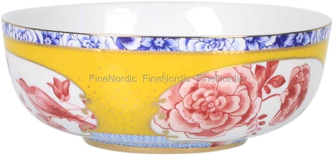 Bringen Sie sommerlichen Sonnenschein auf den Tisch mit dieser attraktiven mehrfarbigen Royal Schüssel von Pip Studio. Sie hat einen Durchmesser von 17 cm und ist mit historischen Emblemen, Vintage Blumen und Vögeln verziert. Was Ihre Aufmerksamkeit zuerst auf diese Schüssel lenken wird, ist die knallgelbe Farbe an der Außenseite der Schüssel. Handbemalte Blüten und raffinierte goldene Details verleihen dieser Royal Schale den letzten Schliff. Sie ist eine wunderschöne Schüssel, und eine tolle Ergänzung Ihrer Pip Studio Royal Sammlung.