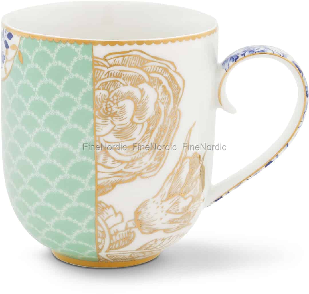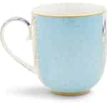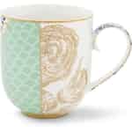 Es ist total einfach sich in diese große Pip Studio Royal Tasse Blue zu verlieben. Das schöne Design, der große Griff und das 325 ml Fassungsvermögen lassen das Herz eines jeden Kaffeeliebhabers höher schlagen. Das Design mit goldenen Punkten auf einem blauen Hintergrund, teilt sich die Außenseite der Tasse mit einem Bereich mit grünem Hintergrund mit einem weißen Blumenmuster und nicht zuletzt mit einem weißen Hintergrund auf dem große goldene Blumen zu sehen sind. Am Griff der Tasse befinden sich blaue Blumen und goldene Linien und am oberen und unteren Teil der Tasse sehen Sie goldene Akzente. Fügen Sie diese Tasse Ihrer Pip Studio Sammlung hinzu oder verwenden Sie sie als Geschenk für einen lieben Menschen. Aufgrund des Dekors muss diese 100% Porzellantasse von Hand gewaschen werden. Sie ist weder für die Spülmaschine noch für die Mikrowelle geeignet.