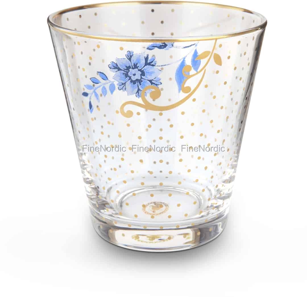 Genießen Sie ein erfrischendes Glas Wasser aus diesem gut aussehenden Wasserglas mit goldfarbenen Punkten. Das Glas ist Teil der Royal Kollektion von Pip Studio. Das durchsichtige Golden Dots Glas ist mit einem auffälligen blauen Blumendesign verziert, welches mit einem exquisiten goldfarbenen Punktmuster kombiniert wird. Der obere Rand ist von einer goldenen Linie umgeben und auf der Unterseite des Glases befindet sich das goldfarbene Pip Logo. Es hat ein Fassungsvermögen von 270 ml und passt wunderbar zur Royal Porzellan Kollektion von Pip Studio. Wenn Sie das Aussehen dieses Wasserglases mögen dann schauen Sie unbedingt auch die anderen Royal Produkte an, die wir in unserem Webshop anbieten.