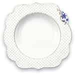 Pip Studio ist bekannt für seine fantasievollen Designs und kräftigen Farben, aber seine Royal White Kollektion ist da vergleichsweise etwas zurückhaltender. Schauen Sie sich doch nur mal diesen Royal Suppenteller an, der nur mit goldenen Punkten und einem kleinen blauen Blütendetail verziert ist. Der Rest des Tellers ist schlicht weiß und ein goldfarbener Rand entlang des Randes des Tellers trägt zu seinem anspruchsvollen Aussehen bei. Er hat einen Durchmesser von 23,5 cm und besteht aus 100% Porzellan. Essen Sie Ihre Suppe mit Stil mit diesem schönen Suppenteller von Pip Studio. Er lässt sich außerdem sehr gut mit dem anderen Royal White Geschirr kombinieren.