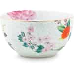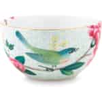 In unserem Webshop finden Sie eine schöne Auswahl an Pip Studio Schüsseln. Sie sind in verschiedenen Mustern und Größen erhältlich und können nach Belieben gemischt werden. So wie zum Beispiel die Blushing Birds White Schale. Diese bunte Schale ist mit exotischen Blumen, einem Vogel und einigen goldenen Details verziert. Der Hintergrund hat ein elegantes Muster. Die große rosa Blume erstreckt sich bis über den Rand und Elemente aus dem Design schmücken auch das Innere der Schüssel. Sie hat einen Durchmesser von 12 cm und besteht aus 100% Porzellan. Verwenden Sie sie als Snackschüssel oder um einen Dip oder Sauce darin zu servieren. Sie können sie wunderbar mit den anderen Porzellansets der Blushing Birds Kollektion kombinieren.