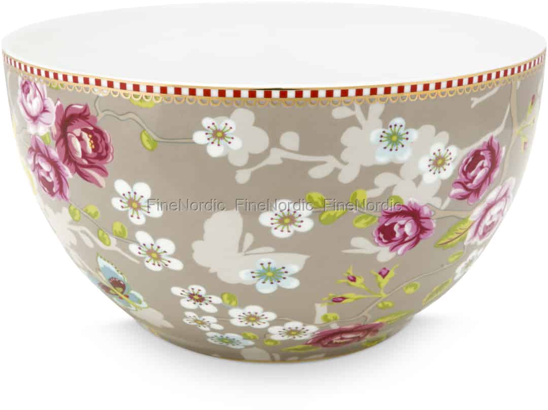 Essen Sie lieber aus einer Schüssel als von einem Teller? Dann könnte diese gut aussehende Schüssel von Pip Studio für Sie von Interesse sein. Die Chinese Rose Khaki Schale ist mit einem wunderschönen Rosenmuster, einem Schmetterling und der bekannten rot-weißen, mit goldenen Akzenten verzierten, Pip Linie geschmückt. Die weiße Innenseite der Porzellanschale bietet einen schönen Kontrast zu ihrer farbenfrohen Außenseite. Essen Sie Suppe, Salat, Müsli und vieles mehr aus dieser khakifarbenen Schüssel. Die Chinese Rose Schale ist auch in einer rosa und in einer hellblauen Version erhältlich.
