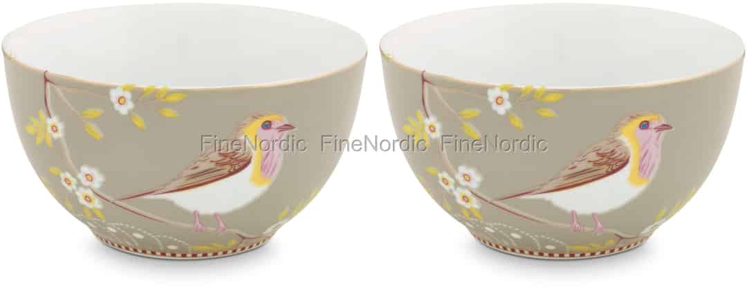Was ist besser als eine schöne Pip Studio Schüssel? Das ist richtig, zwei Pip Studio Schüsseln. Schauen Sie sich diese beiden fantastischen Early Bird Khaki Schalen doch mal etwas genauer an. Die Khaki Schalen sind mit einem niedlichen Vögelchen geschmückt, der auf einem blühenden Ast sitzt. Die markante rot-weiße Linie von Pip Studio mit goldenen Akzenten ist am unteren Rand jeder Schüssel zu sehen. Verwenden Sie diese Schalen als Frühstücksschalen, Snackschalen oder Salatschüsseln und ihr Inhalt wird gleich doppelt so gut schmecken, denn das Auge isst ja bekanntlich mit. Diese Porzellanschalen können mit den anderen Khaki Early Bird Geschirrprodukten kombiniert werden. Sie können sie auch mit den rosa und blauen Early Bird Geschirrteilen mischen, um den gedeckten Tisch noch farbenfroher aussehen zu lassen. Diese runden Schalen werden in einer hübsch aussehenden Geschenkbox geliefert, weswegen sie sich auch als eine schöne Geschenkidee für einen Pip Studio Sammler eignet.