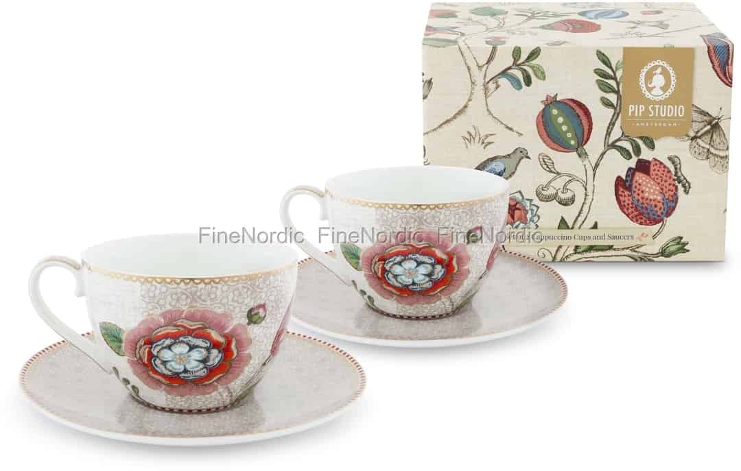 Einen guten Cappuccino zu trinken macht am meisten Spaß, wenn man es zusammen mit einem guten Freund oder einer lieben Person macht. Das Pip Studio Cappuccino Tasse und Untertassen Set Spring to Life Off-White ist praktischerweise als Zweierset erhältlich. Es hat nicht nur eine Kapazität von 280 ml, es ist auch sehr hübsch anzusehen. Das schöne Blumenmuster und die perfekt aufeinander abgestimmten Farben sorgen für gute Laune auf dem Tisch. Die Spring to Life Cappuccino-Tassen und Untertassen sind zudem mit dem berühmten rot-weißen Pip-Streifen mit goldenen Details versehen. Sie bestehen aus 100% Porzellan und lassen sich leicht mit anderem Pip Studio Porzellan kombinieren. Bitte waschen Sie sie von Hand, denn aufgrund des Dekors sind sie nicht spülmaschinenfest und sollten auch nicht in der Mikrowelle verwendet werden.