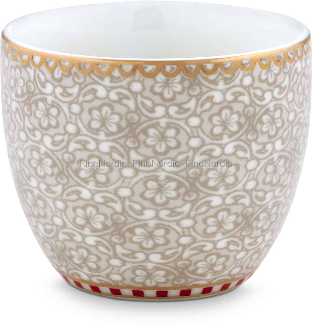 Pip Studio's Eierbecher Spring to Life Off-White ist von außen mit zarten Ranken und Blüten bedeckt, die oben mit goldenen Akzenten eingerahmt sind und am Boden des Bechers den berühmten rot-weißen Pip Streifen vorweisen. Sie finden eine kleine Überraschung auf der weißen Innenseite der Tasse, wo Ihnen eine zierliche blaue Blume entgegenschaut. Decken Sie den Frühstückstisch mit diesem schönen Spring to Life Eierbecher oder stellen Sie ihn gemischt mit anderen Eierbechern von Pip Studio auf den Tisch. Sie können auch verschiedene Porzellanprodukte aus der Spring to Life-Kollektion dazustellen. Der Spring to Life Off-White Eierbecher ist eine schöne Ergänzung für Ihre Pip Sammlung und kann auch als ein charmantes Gastgeber Geschenk oder ein kleines Dankeschön an einen hilfsbereiten Nachbarn dienen. Aufgrund des Dekors muss dieser Eierbecher aus 100% Porzellan von Hand gewaschen werden. Er ist nicht spülmaschinenfest und auch nicht mikrowellengeeignet.