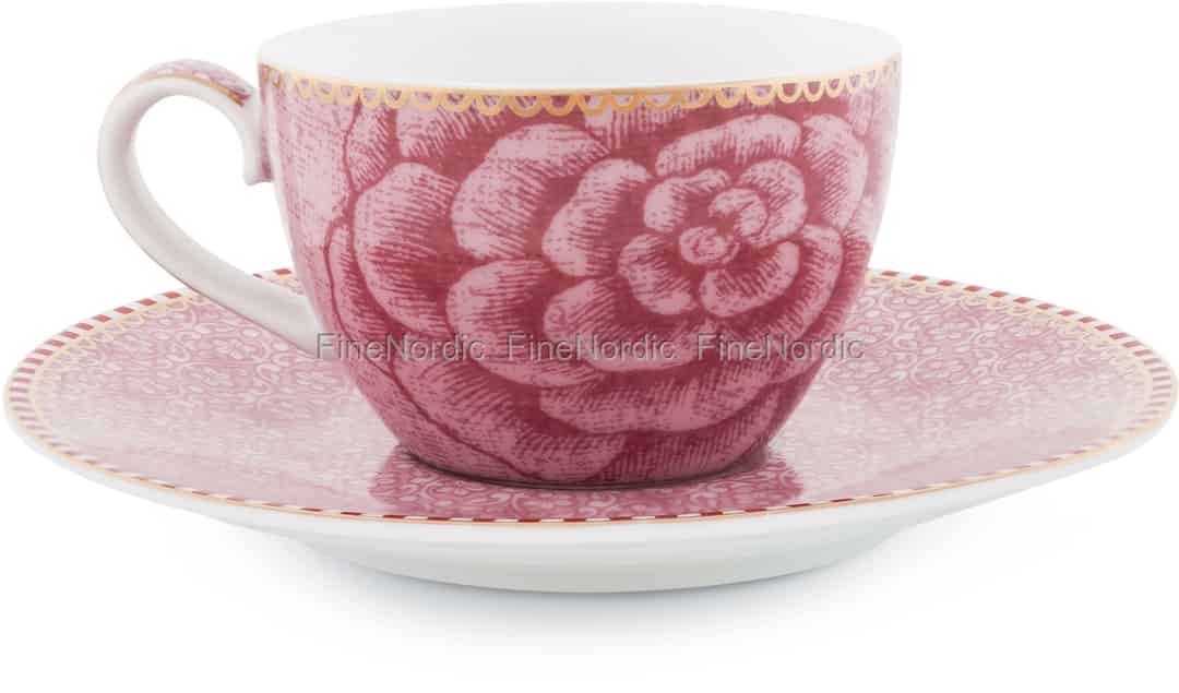 Trinken Sie Ihren Espresso auf elegante Weise mit dieser Espressotasse und Untertasse von Pip Studio. Dieses Spring to Life Tassen-und-Untertassen-Set besteht aus hochwertigem Porzellan in einer atemberaubenden rosa Farbe gehalten. Die Tasse ist mit einer schönen Rose und kleinen goldfarbenen Akzenten verziert. Die Untertasse ist zudem mit goldfarbenen Akzenten in Kombination mit einem antiken Blumenmuster und dem markanten rot-weißen Pip Streifen verziert. Die Tasse hat ein Fassungsvermögen von 75 ml. Diese Tasse und Untertasse lassen sich gut mit den anderen Spring to Life Pink Produkten von Pip Studio kombinieren.