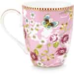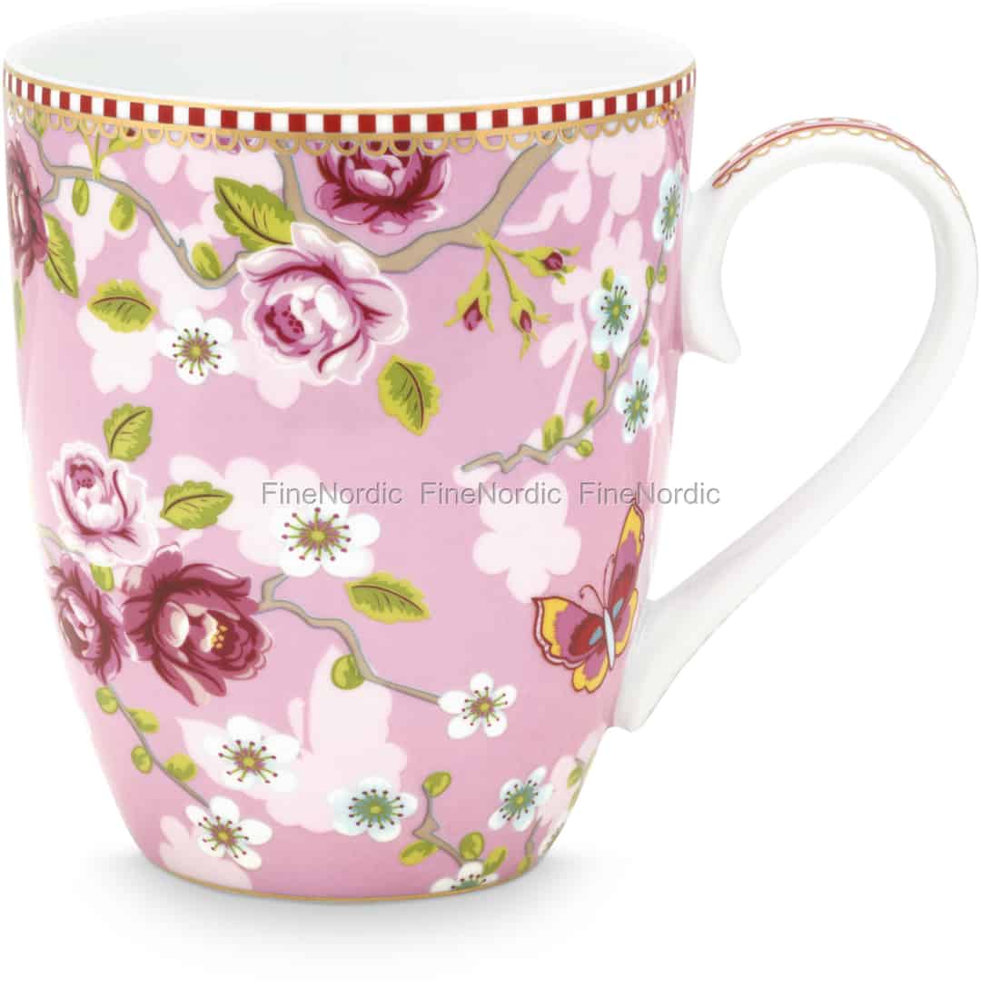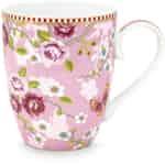 Genießen Sie einen aromatischen Tee oder Kaffee aus dieser großen Chinese Rose Pink Tasse von Pip Studio. Die rosa Tasse ist mit einem schönen Blumendruck und herrlichen goldenen Details verziert. Die Henkeltasse hat ein Fassungsvermögen von 350 ml und ist aus feinem Porzellan gemacht. Die farbenfrohe Außenseite dieser Tasse bietet einen schönen Kontrast zur ihrer schlichten weißen Innenseite. Der Chinese Rose Henkelbecher ist auch in einer blauen und einer khakifarbenen Version erhältlich.