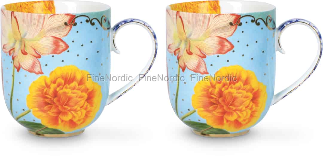 Wow, das schöne bunte Design dieser Pip Studio Tasse sieht nicht nur fantastisch aus, sondern weckt Sie bestimmt auch auf, wenn Sie damit Ihren Morgenkaffee trinken. Die Royal Flowers Tasse wird im 2er-Set geliefert und so können Sie einen Kaffee oder Tee zusammen mit Ihrem Lieblingsmensch genießen. Die Tassen haben je ein Fassungsvermögen von 325 ml und sie sind durch ihren großen Henkel leicht zu halten. Der hellblaue Hintergrund der Tasse ist mit wunderschönen leuchtendbunten Blumen und goldenen Details geschmückt. Dieses Tassen-Set ist außerdem auch eine schöne Geschenkidee für einen Pip Studio Sammler. Aufgrund ihrer goldenen Details sind die Tassen weder spülmaschinenfest noch mikrowellengeeignet. Wir empfehlen, sie von Hand zu waschen.