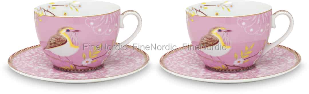 Dieses Pip Studio Tassen und Untertassen Set ist mit dem wunderschönen Early Bird Muster verziert, das aus einem Vogel und exotischen Blumen besteht. Die beiden rosa Tassen und Untertassen bestehen aus hochwertigem Porzellan und werden in einer hübschen Geschenkbox geliefert. Jede Tasse hat ein Fassungsvermögen von 280 ml und damit können Sie mit Ihrer Freundin oder Ihrem Partner eine heiße Tasse Tee oder Kaffee genießen. Die Porzellantassen und Untertassen sind auch eine schöne Geschenkidee für einen Pip Studio Fan, da sie praktischerweise schon in einer Geschenkbox geliefert werden.
