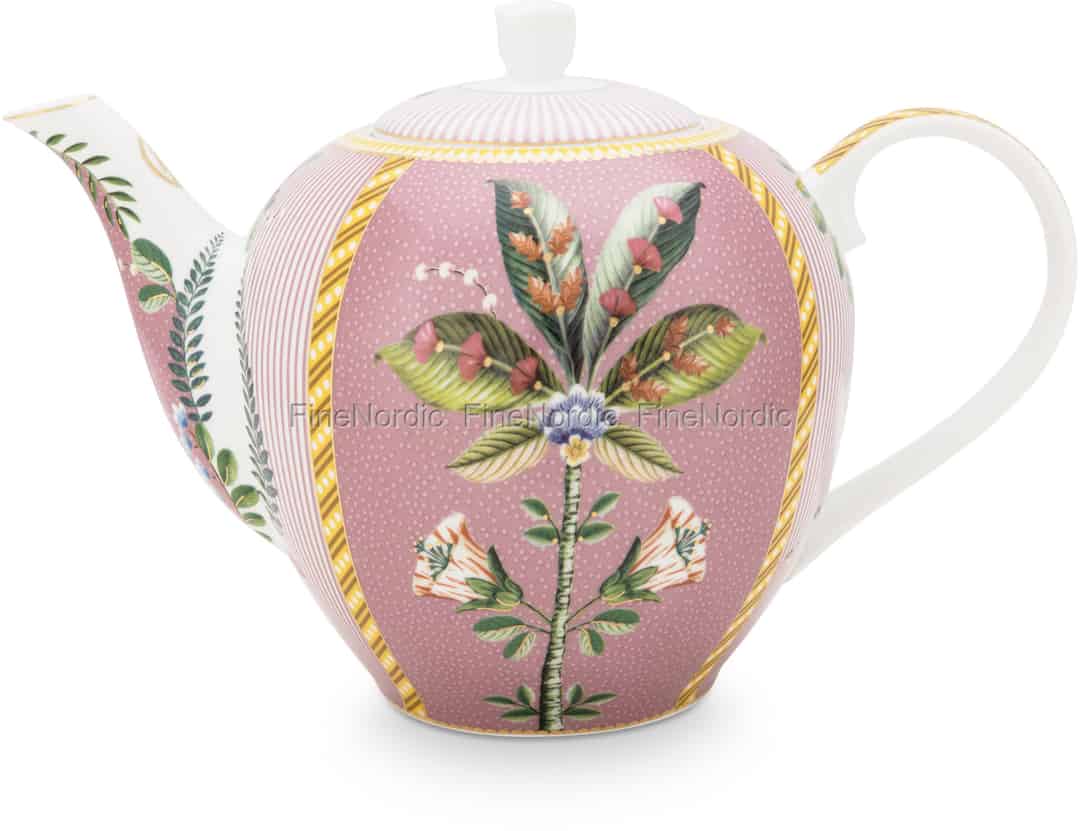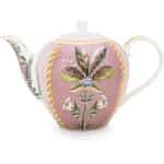 Schauen Sie sich diese wunderschöne Teekanne von Pip Studio doch mal etwas genauer an. Die Teekanne La Majorelle Pink zeichnet sich durch ein ausgefallenes Design, wunderbare Farbkombinationen und hervorragende Qualität aus. Die rosa Kanne hat ein Fassungsvermögen von 1,6 Litern und ist mit zwei fantastisch aussehenden Palmen, exotischen Blumen und goldenen Details geschmückt. Der Porzellanrosengriff verschönert den Kannendeckel, und der große Henkel erleichtert das Anheben und Tragen der Teekanne. Die Porzellankanne lässt sich gut mit den anderen Porzellanprodukten kombinieren, die die La Majorelle Kollektion von Pip Studio zu bieten hat. Sie finden sie alle direkt hier in unserem Webshop.