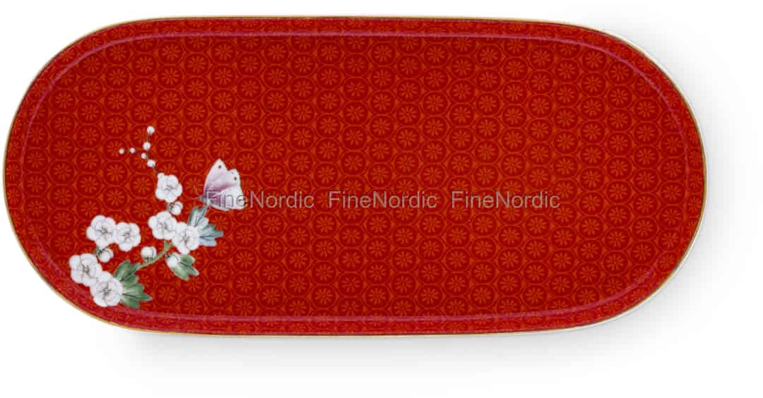 Der Pip Studio Sugar & Creamer Kamini Red Teller zeichnet sich durch seine schöne rote Farbe und hübsches Blumenmuster aus. Der rote Hintergrund ist mit einem eleganten Print verziert und dazu schmücken exotische weiße Blumen und ein Schmetterling diesen Teller. Das Porzellantablett hat einen goldfarbenen Rand, der ihm den letzten Schliff verleiht. Sie können ihn als Untersetzer für Ihr Milchkännchen und Zuckerdose sowie als Serviertablett für ein paar kleinen Vorspeisen oder Leckerbissen verwenden. Das längliche, an den Enden abgerundete Tablett kann auch als Herzstück auf dem Tisch verwendet werden und Sie können es je nach Jahreszeit entsprechend dekorieren. Dieser exquisit aussehende und vielseitige Kamini Red Zucker und Milchkännchen Teller sollte auf keinen Fall in Ihrer Pip Studio Kollektion fehlen.