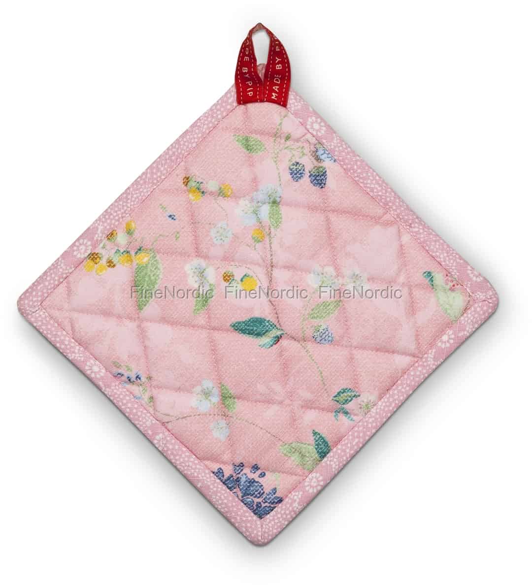 Suchen Sie ein Geburtstagsgeschenk für eine liebe Freundin? Eine die gerne kocht und backt? Dann könnte dieser Pip Studio Topflappen die perfekte Geschenkidee für sie sein! Der quadratische pinkfarbene Topflappen hat auf der Rückseite eine praktische Tasche, in die man zum einfachen Halten seine Hand stecken kann. Wenn er mal gerade nicht in Benutzung ist, dann kann er an seiner Schlaufe aufgehängt werden. Auf diese Weise erhält die Küche gleich auch eine zusätzliche Dekoration. Wenn er mal schmutzig geworden ist, dann können Sie ihn einfach bei 30 ° C in der Waschmaschine waschen und schon ist er wieder einsatzbereit. Ganz besonders lieben wir an diesem Topfhalter die bunten Blumen und Kolibris auf dem rosa Hintergrund. Dieser Topflappen ist auch in den Farben Khaki und Blau erhältlich. Diese finden Sie beide hier in unserem Webshop.