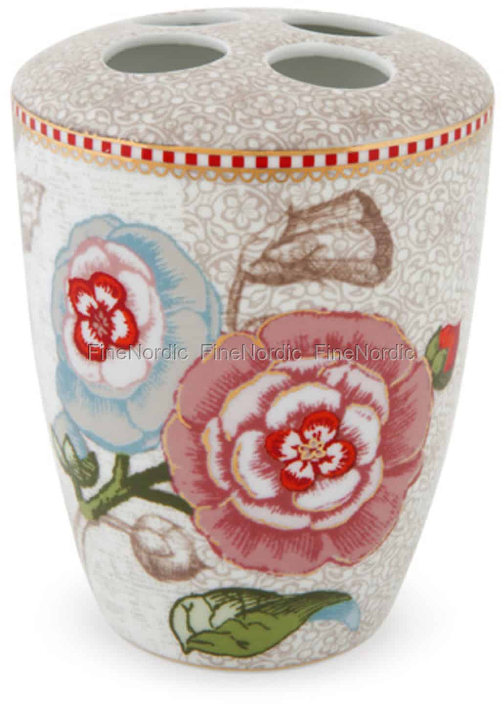 Dieser cremefarbene Zahnbürstenhalter ist Teil der Spring to Life Kollektion von Pip Studio. Er besteht aus hochwertigem Porzellan und bietet reichlich Platz für vier Zahnbürsten. Er ist mit bunten Blumen und goldfarbenen Akzenten verziert und die markante rot-weiße Pip Linie ist ebenfalls darauf zu sehen. Kombinieren Sie ihn mit der passenden Spring to Life Off White Tasse und Seifenspender. Diese finden Sie außerdem hier in unserem Webshop. Kaufen Sie den Spring to Life Zahnbürstenhalter für sich selbst oder nutzen Sie ihn als Geschenk für einen Pip Studio Fan.