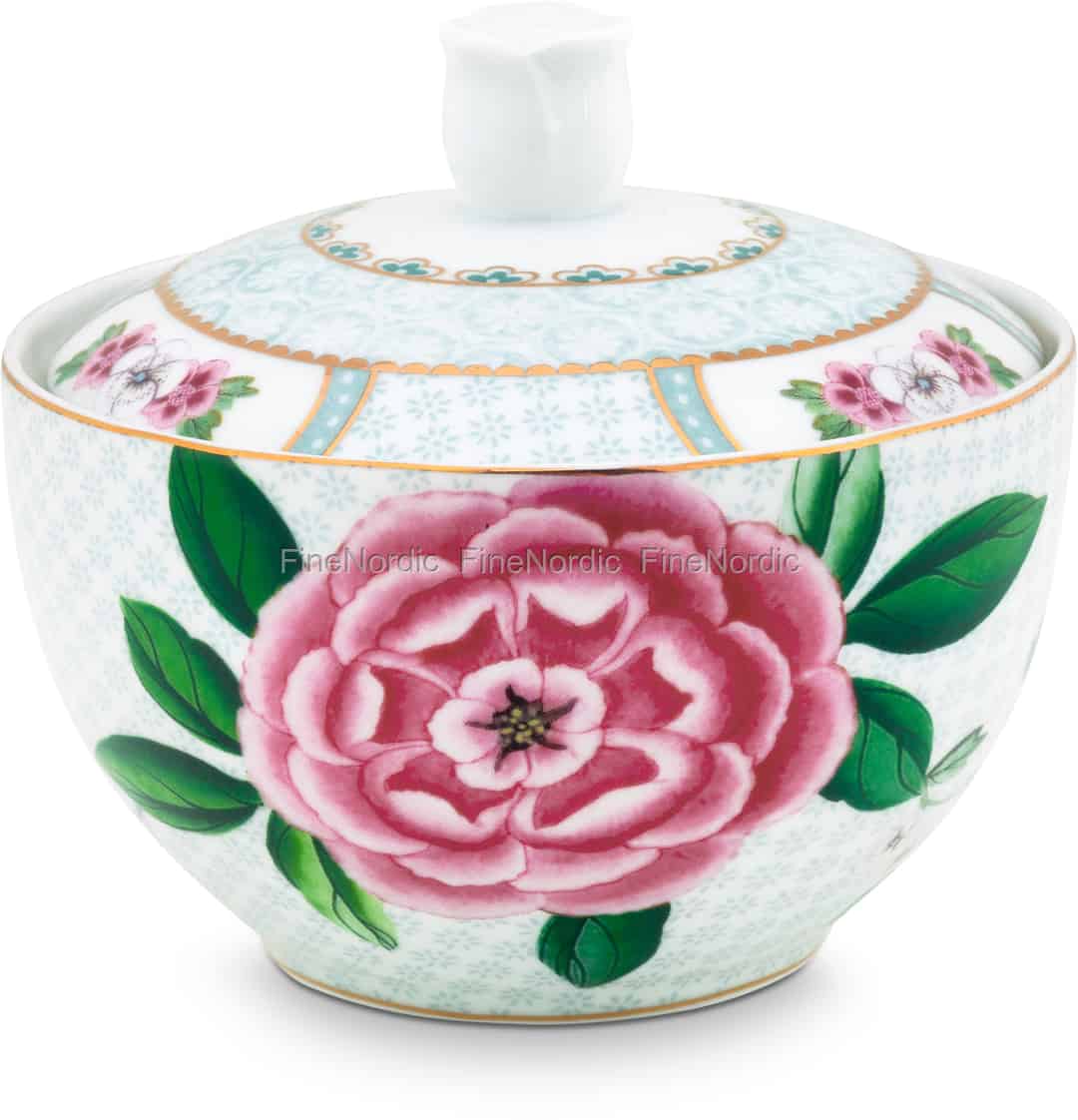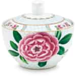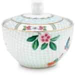 Trinken Sie Ihren Kaffee oder Tee gerne mit etwas Zucker? Dann schauen Sie sich doch mal diese attraktive Zuckerdose von Pip Studio an. Die Zuckerdose Blushing Birds White ist mit exotischen Blumen, einem bunten Schmetterling und feinen goldenen Details verziert. Der Hintergrund hat einen eleganten hellen Print und eine Porzellanrose ziert die Oberseite des Deckels. Die Zuckerdose hat ein Fassungsvermögen von 300 ml und lässt sich gut mit den anderen Kaffee und Tee Sets der Blushing Birds Kollektion kombinieren. Die Zuckerdose bietet nicht nur eine schöne Aufbewahrungsmöglichkeit für Ihren Zucker, sondern sie ist auch ein sehr dekorativer Porzellanartikel für die Küchentheke.