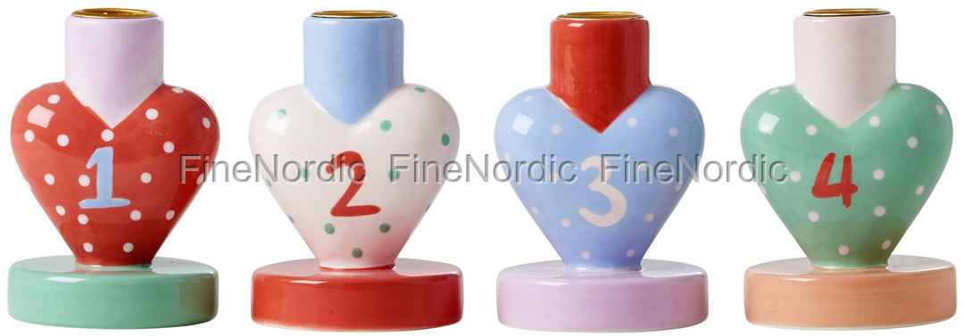 Mit den herzförmigen Adventskerzenhaltern von Rice können Sie Ihre Adventskerzen mal auf eine etwas andere Art und Weise zur Schau stellen. Jeder Kerzenhalter ist in einer anderen Farbe bemalt und alle sind mit fröhlichen Punkten geschmückt und mit den Nummern 1 bis 4. Stellen Sie sie doch mit Tannenzweigen oder Tannenzapfen zusammen auf den Tisch. Fügen Sie einige Weihnachtsdekorationen und Kerzen mit einem 2 cm Durchmesser hinzu und schon haben Sie ein schönes Prunkstück für die Adventszeit. Die Kerzenhalter aus Keramik sind auch ein schönes vorweihnachtliches Geschenk für ein Familienmitglied oder einen lieben Freund.