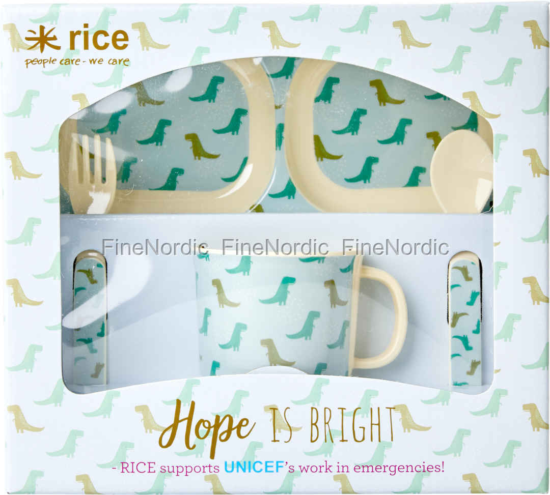 Das allererste Geschirrset Ihres Kindes könnte dieses reizende 4-teilige Set von Rice werden. Das Rice Dino Print Baby Dinner Set besteht aus strapazierfähigem Melamin und ist einfach zu putzig. Dinosaurier können Sie auf jedem einzelnen Geschirrteil in diesem Set entdecken: auf dem Teller, der Tasse, dem Löffel und der Gabel. Der Menüteller hat vier Fächer und wird einen pingeligen Esser glücklich machen. Dieses Geschirrset ist sehr gut für kleine Hände und Finger geeignet. Es wird in einer schönen Geschenkbox mit durchsichtiger Front geliefert. Kaufen Sie es für Ihr eigenes kleines Kind oder nutzen Sie es als Geschenk für ein liebes. Geburtstagskind. Wenn Ihnen das Design des Rice Dino Prints gefällt, dann werfen Sie doch auch mal einen Blick auf alle anderen Produkte, die wir mit demselben Print anbieten. Sie finden sie alle in unserem Webshop