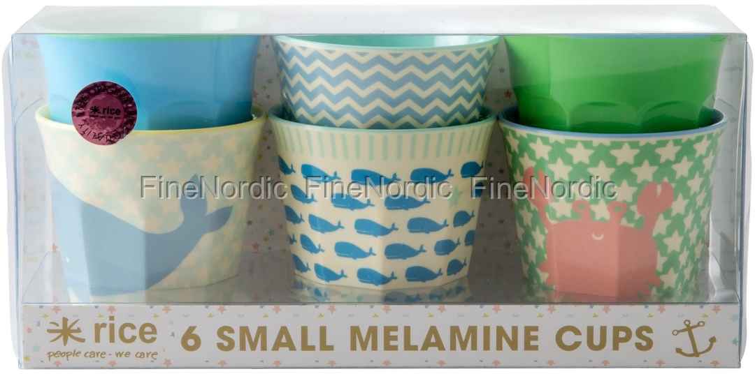 Box mit 6 kleinen Melaminbechern in Blau und Grün Kids Ocean Life Print 6et Set, von RICE.