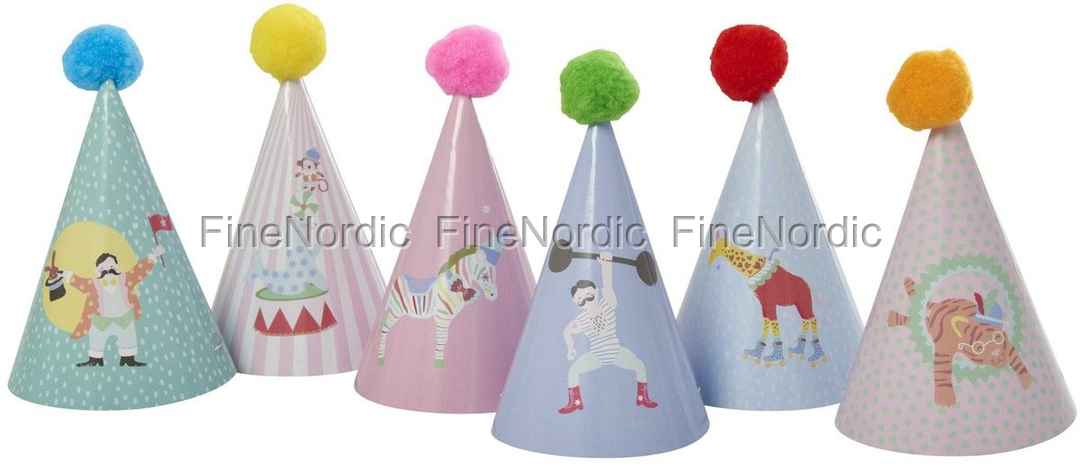 Kinder Papier Party Hut mit Bommel - Cirkus Theme Print - 6er Pack, von Rice.
