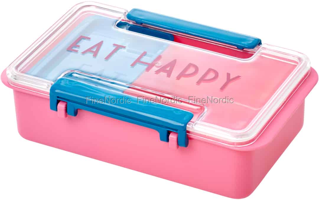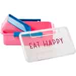 Eine nette Kinderlunchbox mit dem Text "Eat Happy". Es ist eine Lunch box mit frischen Farben: blau und pink. Im Inneren befindet sich eine kleine Schachtel, die sich perfekt für ein leckeres Dessert oder einen Snack eignet. Hier online kaufen, Lunchbox mit Eat Happy Wortlaut - Rosa, von Rice.