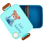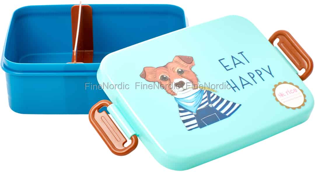 Hier ist eine schöne Kinderbox mit Hundebild und Teiler. Schon beim Anblick des niedlichen Hofhundes macht man gute Laune - und kann "fröhlich essen". Vielleicht hat das Kind einen Hund oder könnte sich zumindest einen wünschen. Die Box ist blau und der Deckel grün. Der Deckel kann aufgesteckt werden. Hier online kaufen, Lunchbox mit Teiler - Farm Animals Print - Grün - Large, von Rice.