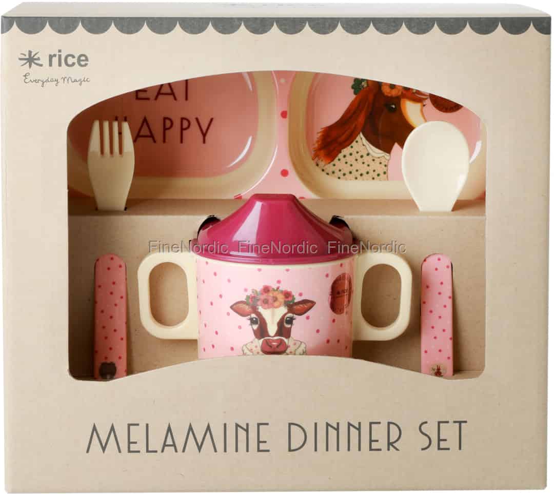 Rice Melamin Baby Geschirr-Set im Geschenkbox - Farm Animals Rosa - 4 Teile