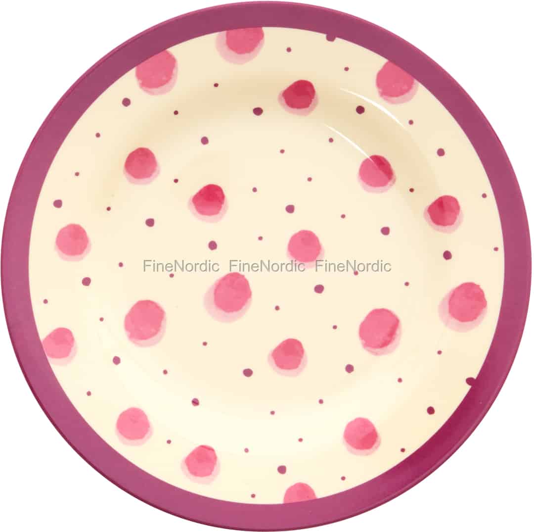 Dieser Teller ist ein kleines Kunstwerk von RICE. Die rosa Punkte sind wie mit Aquarell gemalt. Hier online kaufen, Melamin Beilagenteller mit Pink Watercolor Splash Print, von Rice.