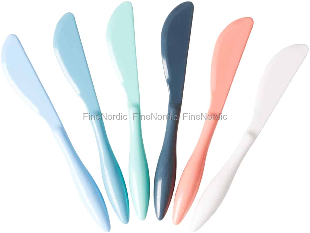 Die Rice Happy 21 Colors Melamin Buttermesser werden als 6er Set geliefert. Sie sind 14 cm lang und jedes Messer hat eine andere Farbe. Die Buttermesser sind spülmaschinenfest, und können so nach Benutzung einfach in die Spülmaschine wandern. Sie sind ideal für Campingausflüge, Gartenpartys und auch für ein Picknick in Park. Sie können sie mit den anderen Rice happy 21-Farben-Produkten gut kombinieren. Wenn Ihnen die Farben dieses Sets nicht gefallen, dann werfen Sie doch mal einen Blick auf die anderen 6-teiligen Rice Messer-Sets, die wir hier in unserem Webshop anbieten.