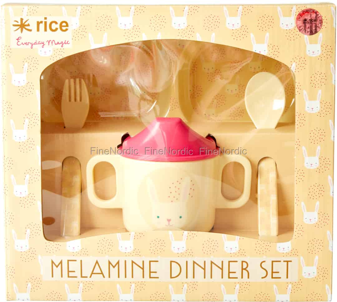 Das allererste Kindergeschirrset für Ihr Baby könnte dieses entzückende 4-teilige Set von Rice sein. Das Rice Rabbit Print Kindergeschirrset besteht aus strapazierfähigem Melamin und ist einfach charmant. Sie finden den süßen Hasen auf jedem Geschirrteil in dieser Packung: auf der Tasse, dem Löffel, der Gabel und dem Teller. Der Menüteller hat vier Fächer. Die Schnabeltasse hat einen Deckel mit Schnabel und an der Tasse sind zwei Griffe. Dieses Geschirrset ist für kleine Hände und Finger sehr gut geeignet. Es wird in einer schönen Geschenkbox mit durchsehbarer Vorderseite geliefert. Kaufen Sie es für Ihr eigenes Baby oder verschenken Sie es an ein kleines Geburtstagskind. Wenn Ihnen das Design des Rice Rabbit Prints gefällt, dann werfen Sie doch bitte auch einen Blick auf all die anderen Produkte, die wir mit dem gleichen Print anbieten. Sie finden sie alle in unserem Webshop.
