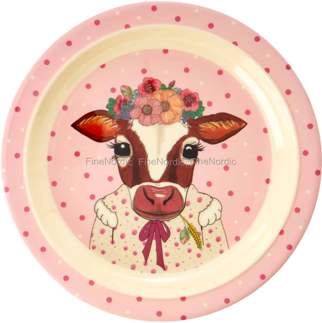 Mal sehen ... wie sieht der süßeste Teller der Welt aus? Könnte ein rosa Teller mit Punkten und eine Bauernhofkuh sein. Ja! Und es gibt sogar feine weiße und rosa Punkte - als Sahnehäubchen. Ziemlich gut gemacht, RICE! Hier online kaufen, Melamin Kindermittagsteller mit Farm Animals Print - Rosa, von Rice.