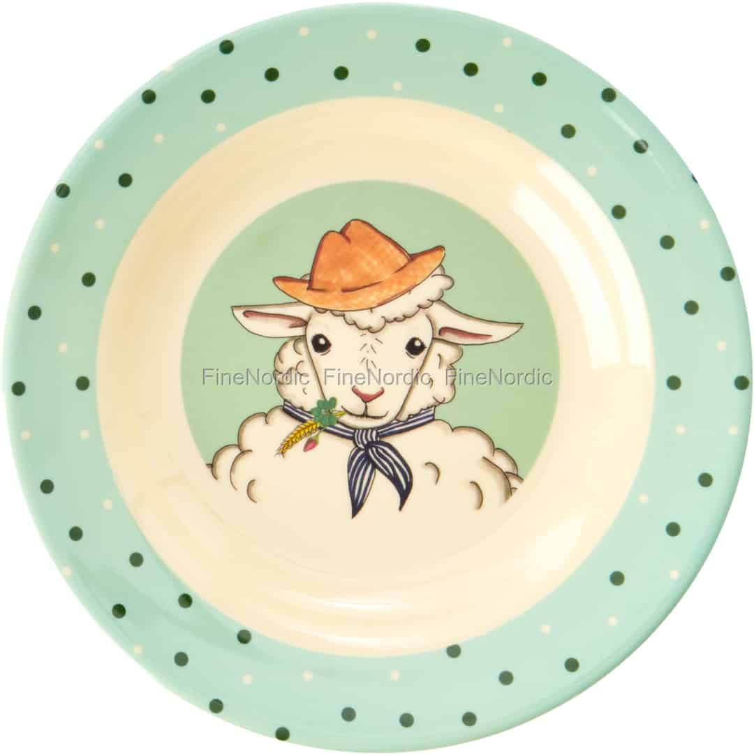 Kinderschale / tiefer Teller aus Melamin mit wunderschönem Farmprint. Die Melaminschale hat eine schöne grüne Farbe und das Schaf vermittelt eine nette und freundliche Bauernatmosphäre. Und sieh dir auch die schönen Punkte an! Hier online kaufen, Melamin Kinderschüssel mit Farm Animals Print - Grün, von Rice.