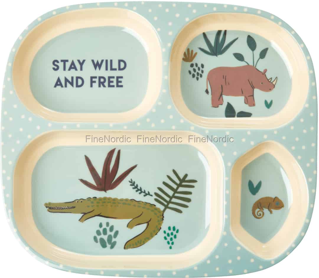 Rice Melamin Kinderteller mit 4 Fächern - Dschungel Tiere - Blau