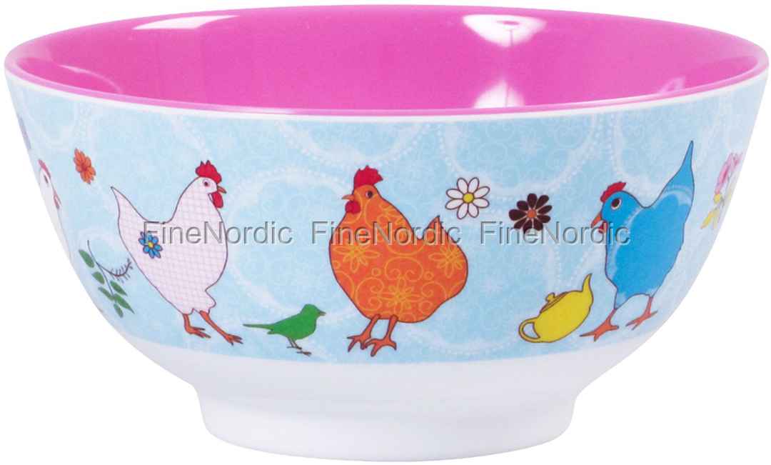 Diese farbenfrohe Melaminschüssel von Rice wird von einer bunten Hühnerschar umkreist. Einige Hennen drehen sich nach rechts, andere nach links und sie sind mit verschiedenen Mustern und Farben geschmückt. Sie können außerdem noch blühende Zweige, Teekannen, Blumen und Vögel auf diesem Print entdecken. Die Schüssel hat ein Fassungsvermögen von 600 ml und ist die perfekte Schüssel für ein Morgenmüsli, für einen Salat zum Mittagessen und für ein Dessert nach dem Abendessen. Dazu ist sie eine großartige Snackschüssel für Drinnen und sowohl auch für Draußen. Nehmen Sie die langlebige Melaminschüssel zu einem Picknick mit, oder wenn Sie campen gehen wollen, oder vielleicht auch wenn Sie mit dem Wohnmobil unterwegs sind. Wenn Ihnen dieser Hen-Print gefällt, dann werfen Sie in unserem Webshop doch bitte auch einen Blick auf die anderen Rice Produkte, die wir mit dem gleichen Print anbieten. Natürlich können Sie diese Schüssel auch mit einigen der vielen anderen fantastischen Rice Prints kombinieren, um so den Tisch noch interessanter und bunter aussehen zu lassen.