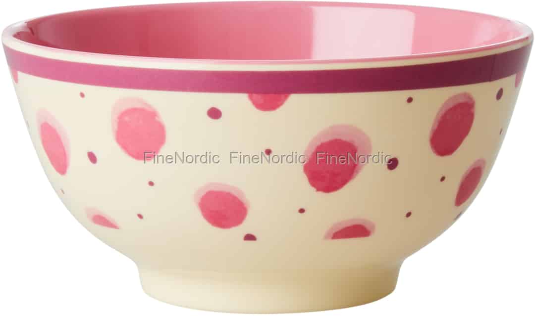 Eine schöne mittelgroße Melaminschale mit rosa Punkten. Es scheint, dass die Punkte mit einem Pinsel in Aquarell gemalt sind, also sieht es tatsächlich ziemlich künstlerisch aus. Hier online kaufen, Melamin Schüssel mit Pink Watercolor Splash Print - Two Tone - Medium, von Rice.