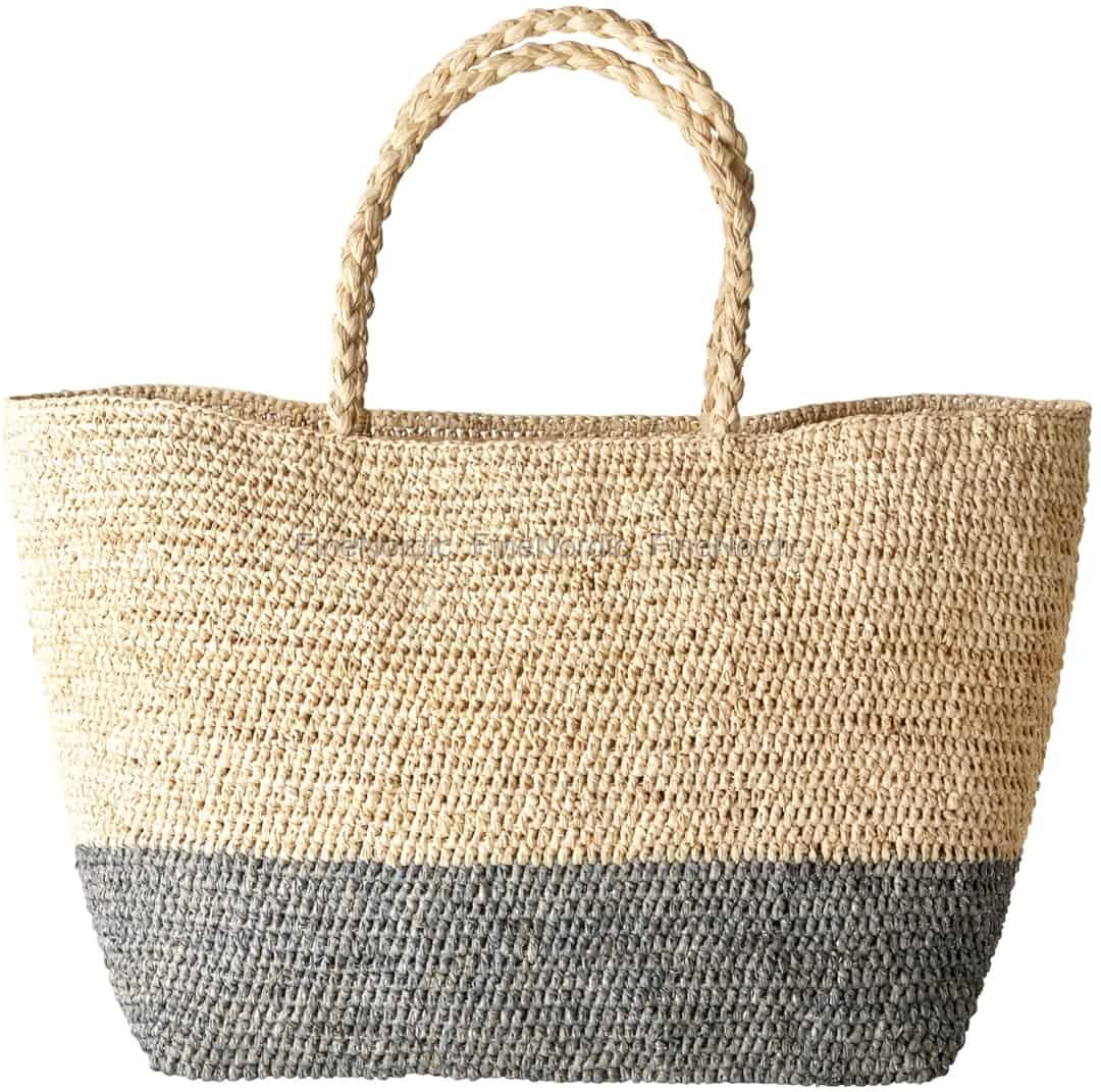 Die große Raffia Tasche von Rice in Natur Farbe, ist zum Boden hin Silber gefärbt. Die geflochtenen Griffe der Tasche verleihen ihr einen besonderen Reiz. Diese Tasche kann ziemlich viel schleppen, aber wenn Sie lange an ihr Freude haben wollen und damit sie weiterhin in gutem Zustand bleibt, dann überladen Sie sie bitte nicht.