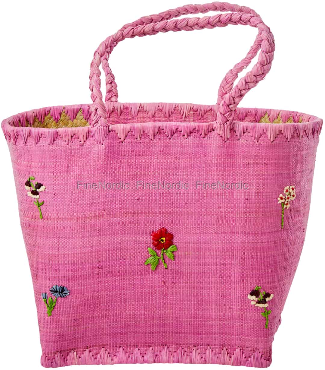 Rice Raffia Einkaufstasche - Blumenstickerei - Plum - Medium