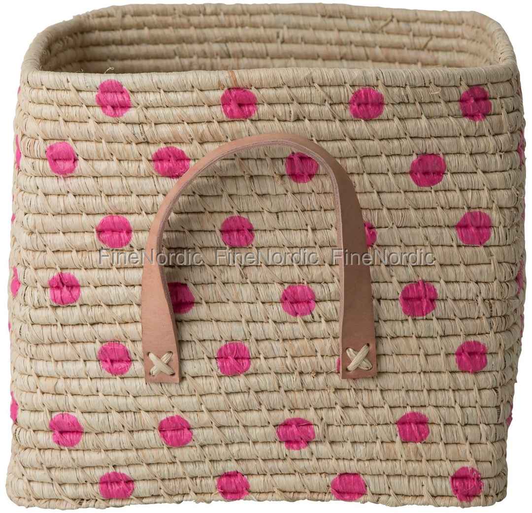 Dieser kleine quadratische Korb aus natürlichem Raffia mit pinkfarbenen Tupfen und Ledergriffen ist nicht nur eine schöne Dekoration, sondern auch eine sehr praktische Aufbewahrungsmöglichkeit. Hebe Karten und Papiere, Kerzen und all die anderen, kleinen Dinge darin auf, die du darin verschwinden lassen willst. Dies trägt dazu bei, den Raum übersichtlicher und aufgeräumter aussehen zu lassen. Er kann in jedem Raum des Hauses verwendet werden, egal ob Sie ihn auf ein Regal, einen Tisch oder auf den Boden stellen. Wir haben die kleinen Rice Raffia Körbe auch mit blauen oder grünen Punkten vorrätig und auch in einfarbigen Versionen können Sie sie in unserem Webshop finden.