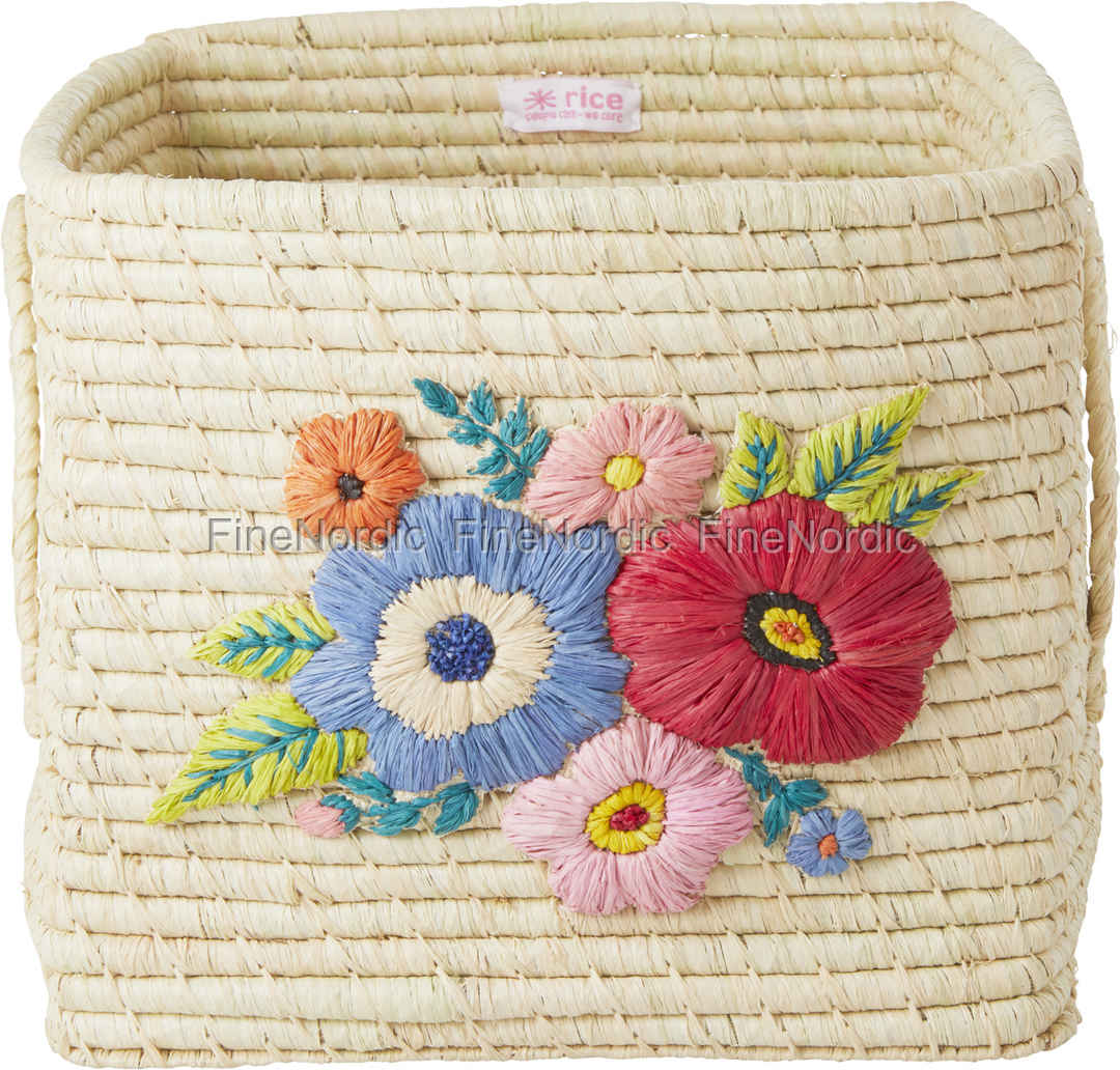 Raffia Korb - Square Basket with Hand Embroidered Flowers - Natural, von RICE.