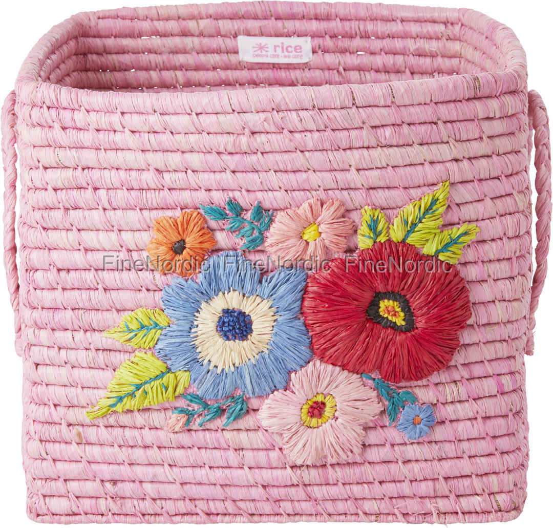 Rice Raffia Korb - Quadratisch - Hand Embroidered Flowers - Pink